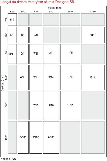 | Dydžių kiekis | mediena 16, PVC 17 |